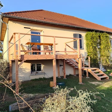 Rê-V ' d’extérieur met un point d’honneur à travailler avec des partenaires locaux, en particulier pour la matière première : le bois. L’essence utilisée pour toutes mes réalisations est le Douglas. Outre ses propriétés mécaniques excellentes ou sa couleur légèrement rosée à la pose qui lui donne un charme tout particulier, c’est surtout pour ses origines régionales (Morvan principalement) et son exploitation par une scierie également locale que j’ai choisi de travailler exclusivement cette essence. Ce circuit court permet à la fois un effort environnemental légitime, et des délais assez courts dans l’approvisionnement.